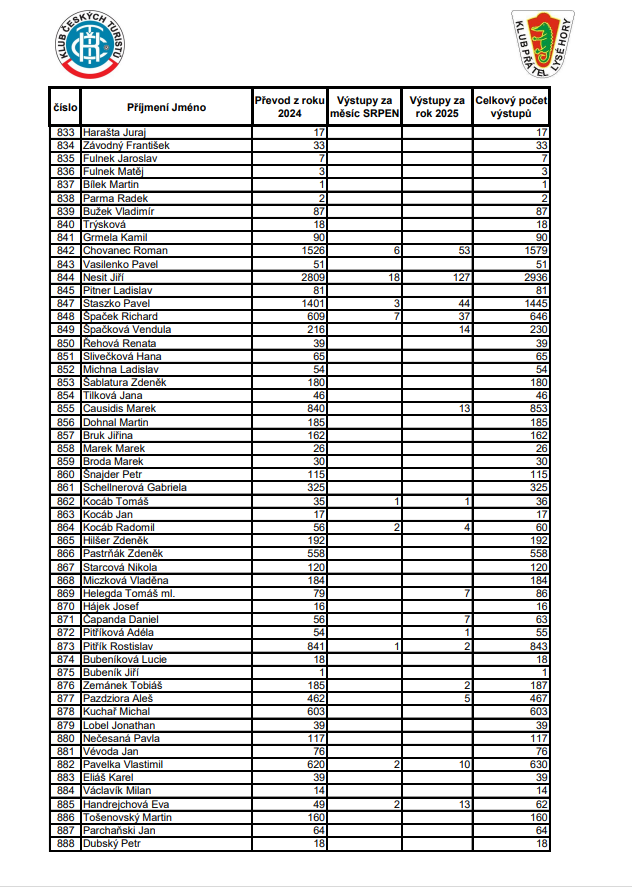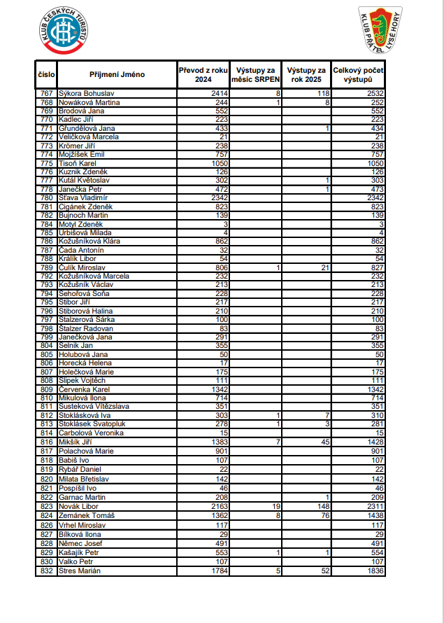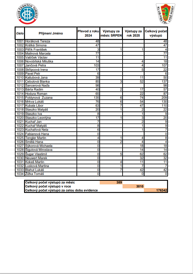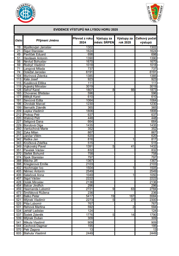 Soupis výstupů na Lysou horu za SRPEN 2025